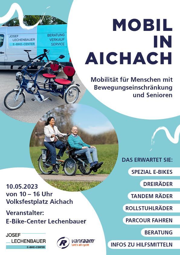 Es gibt viele verschiedene Modelle an E-Bikes, die für Senioreninnen, Senioren und körperlich eingeschränkten Personen geeignet sind. Bei der Auswahl des E-Bikes ist es wichtig auf eine gute Funktionalität und Qualität zu achten. Die Firma Josef Lechenbauer E-Bike-Center ermöglicht nun am 10.5.2023 auf dem Volksfestplatz in Aichach, diese Fahrzeuge zu begutachten und auch eine Probefahrt dort durchzuführen. Es stehen Berater und Beraterinnen als auch Gesprächspartner aus dem Hause VanRaam von 10:00 – 17:00 Uhr zur Verfügung.