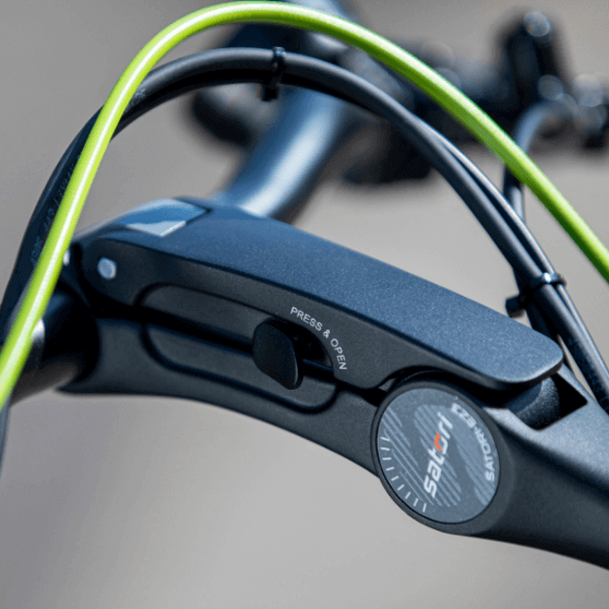 - Entfernen Sie die Klettverschlüsse am Rahmen und auch das rechte Handstück vom Lenker in dem Sie die 2 kleinen Bällchen eindrücken. Legen Sie das Handstück beispielsweise auf den Fahrradträger.