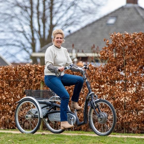 Van Raam hat eine Variante des traditionellen Dreirades. Dieses hat einen tiefen geräumigen Einstieg und eine andere Sitzposition. Ihre Sitzposition ist dadurch etwas niedriger und Sie können jederzeit mit beiden Beinen den Boden erreichen und trotzdem die optimale Kniebewegung ausführen. Bei dieser Variante müssen Sie Ihr Bein beim Aufsteigen nicht zu sehr anheben, sondern können das Fahrrad unter ihrem Körper durchziehen, um darauf zu sitzen.